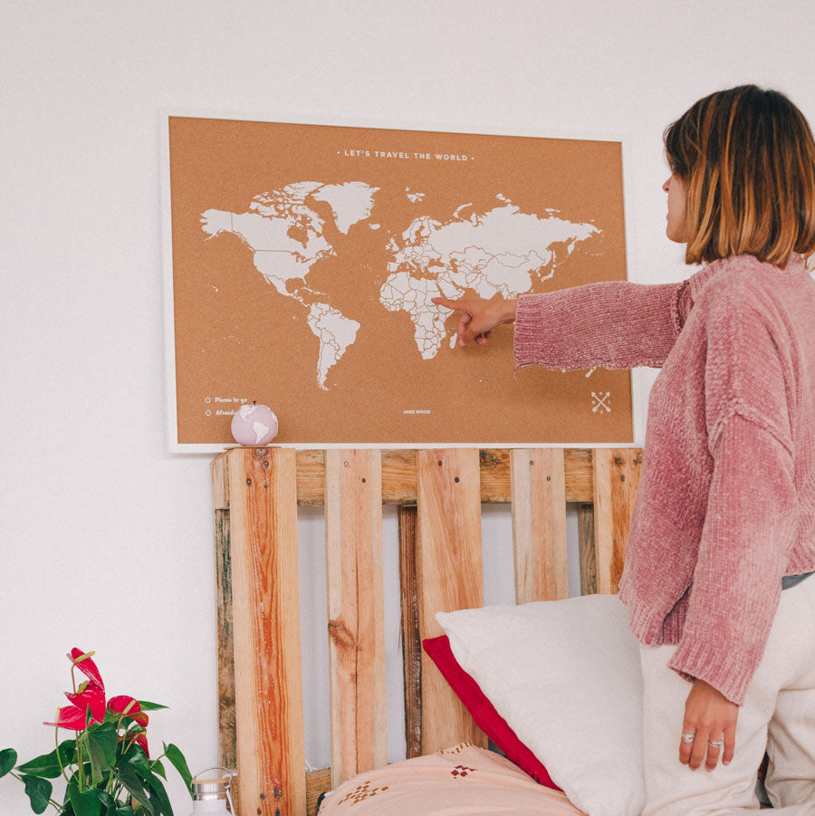 Eine Weltkarte für Reisefreudige, um die bereits besuchten Orte zu markieren; ein unvergessliches Detail und das bestmögliche Geschenk. Hier können Sie Ihre schönsten Erinnerungen aufhängen: Pins, Flugtickets, Konzertkarten...