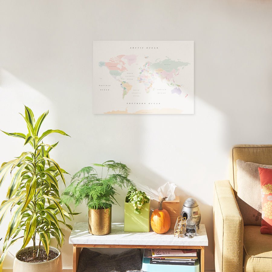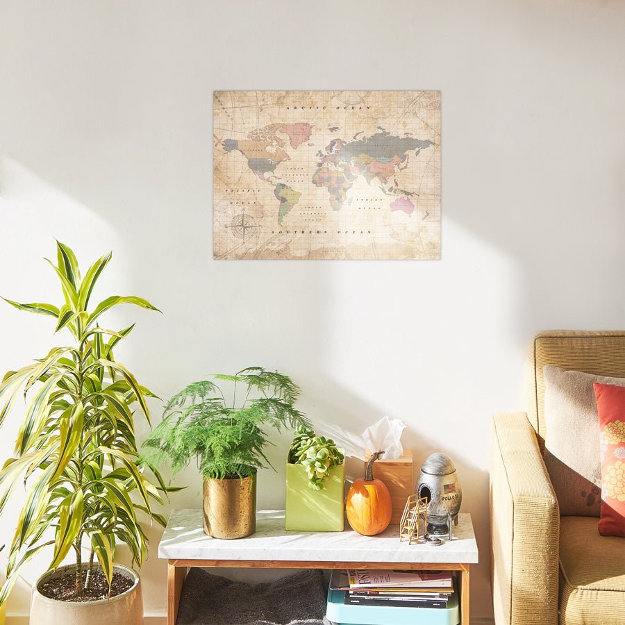 · Multicolour map: The Watercolor collection is digitally printed, allowing you to print several colours simultaneously. One of the main features of these models is that they include the names of the countries, and each one is a different hue. The traditional political map we used to learn geography is now adapted to home decor. All the collection's maps have a vintage twist and will remind you of those old maps hanging in your grandma's house. You can choose from many shades and colour combinations. If this is the model you like best, we recommend going for the tints that best match the dominant colours of the space for which the map is intended