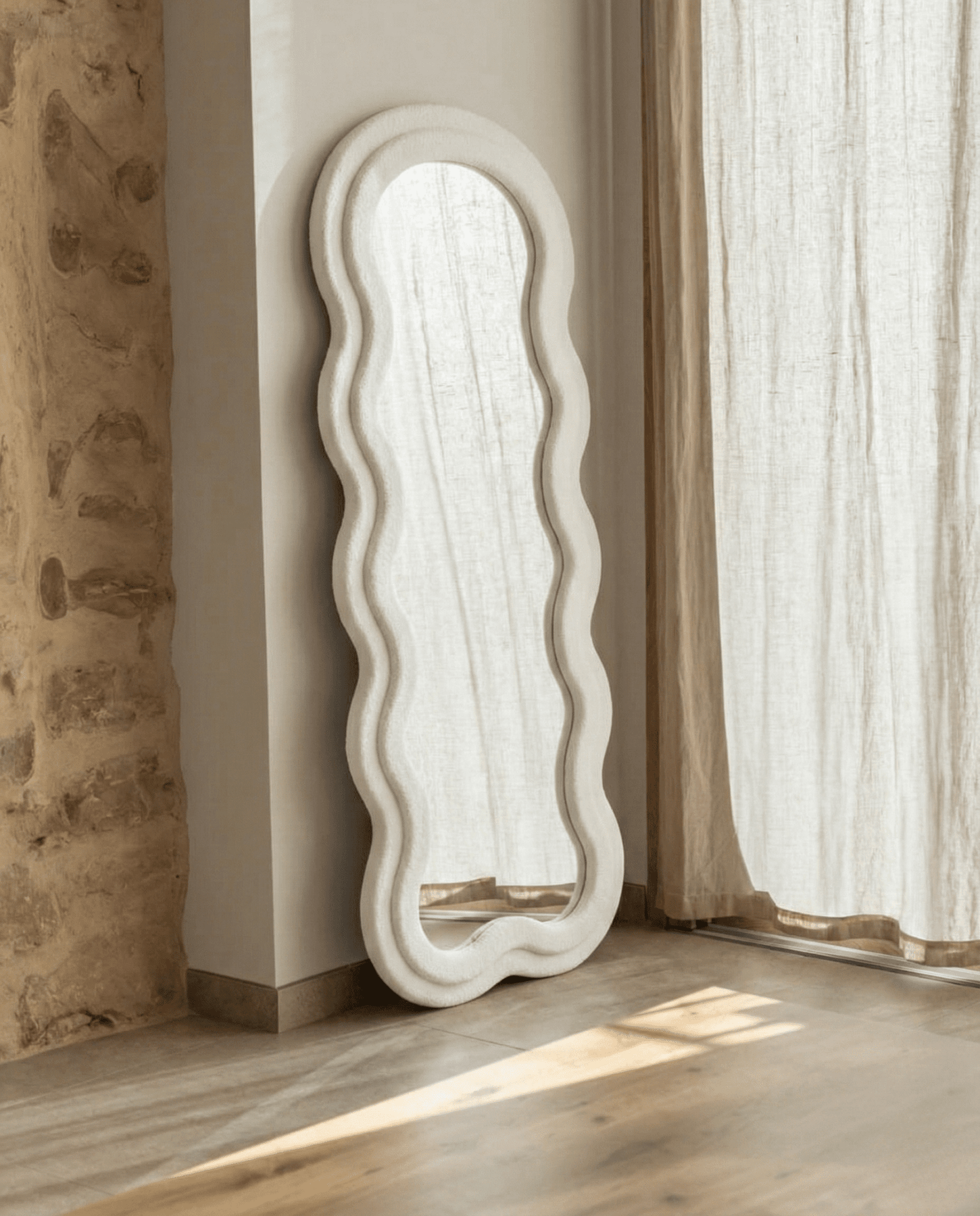Dale personalidad y calidez a cualquier rincón con este espejo de diseño orgánico y textura suave. Su tejido teddy aporta un toque acogedor y en tendencia, perfecto para cualquier espacio. Puedes apoyarlo en el suelo o colgarlo fácilmente gracias a sus ganchos traseros.