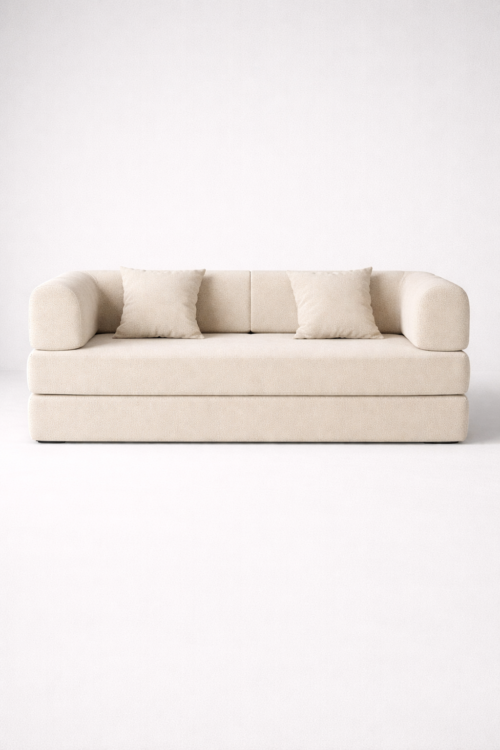 El sofá cama modular Iris, llega a tu casa en formato compacto y, al abrirlo, se expande lentamente hasta recuperar su volumen original. Como si el confort despertara.